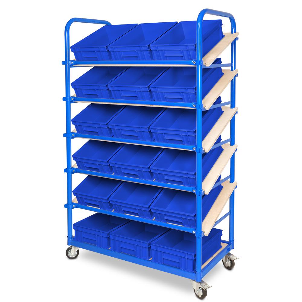 Schrägbodenregalwagen mit 6 Ebenen, BxTxH 1050x500x1690 mm, 4 Lenkrollen, 2 Rollen mit Feststellbremse, bestückt mit 18 Euroboxen BxTxH 400x300x120 mm, mit Griffleisten