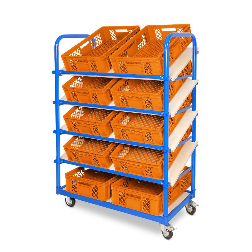 Dieser Schrägbodenregalwagen ist das ideale Transportmittel in Industriebereichen und für die Kommissionierung im Lager, wie auch für die Materialbereitstellung in der Montage bestens geeignet.