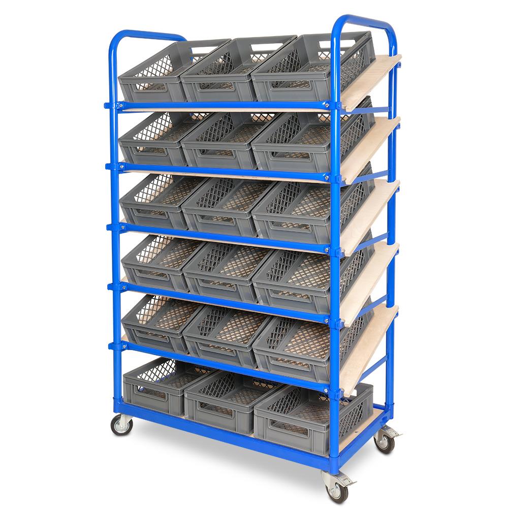 "Schrägboden-Regalwagen mit 6 Ebenen, BxTxH 1050x500x1690 mm, 4 Lenkrollen, 2 Rollen mit Feststellbremse, bestückt mit 18 Euroboxen BxTxH 400x300x125 mm, durchbrochen, mit Durchfassgriffen"