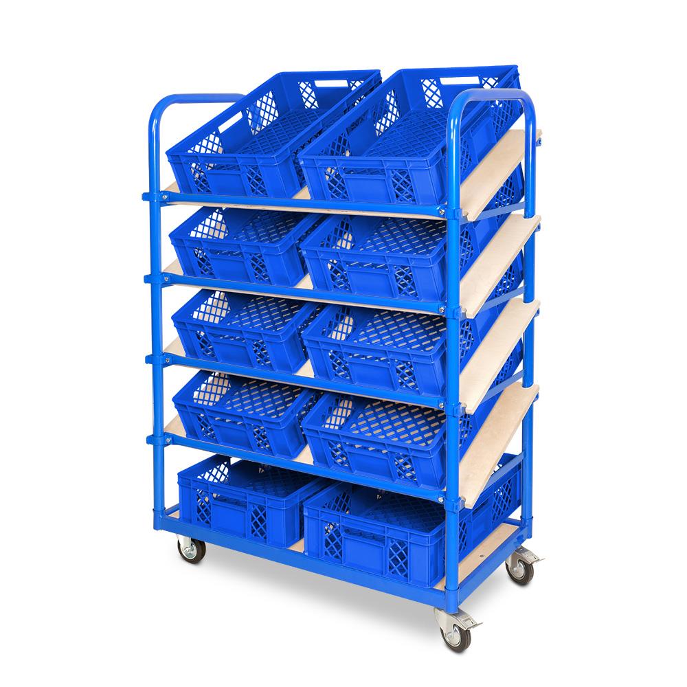 Dieser Schrägbodenregalwagen ist das ideale Transportmittel in Industriebereichen und für die Kommissionierung im Lager, wie auch für die Materialbereitstellung in der Montage bestens geeignet.