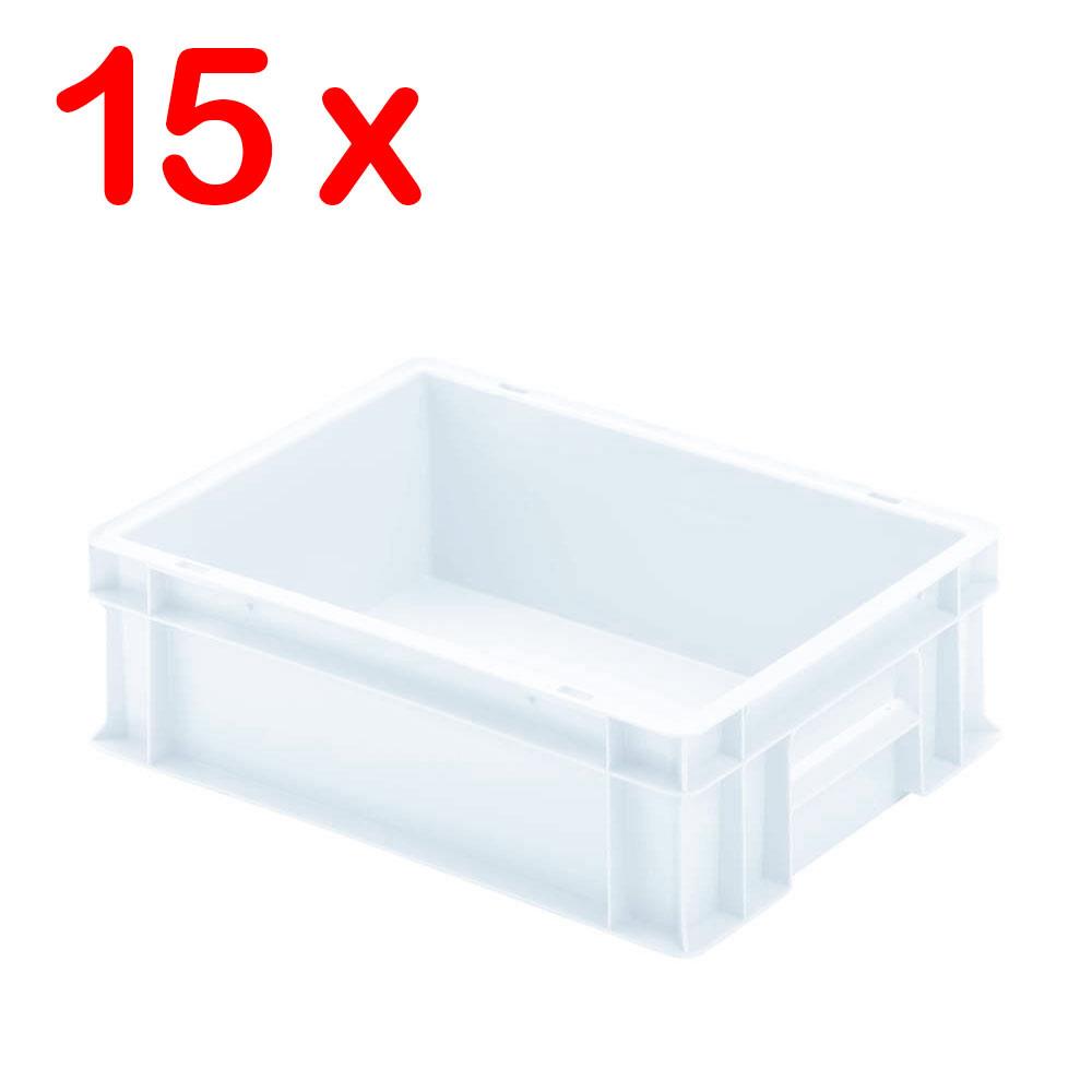 Das fahrbare Regal ist mit 15 robusten Euro-Stapelboxen im Format 400x300x120 mm bestückt. Diese Eurobehälter überzeugen durch erstklassige Qualität. Die Kunststoffboxen sind die idealen Lager- und Transportbehälter für Industrie und Handwerk. Glatte Innenwände ermöglichen eine leichte und hygienische Reinigung der Boxen. Die Behälter sind extrem stabil und langlebig, spülmaschinenfest und gegen die meisten Chemikalien beständig. Kältebeständig bis -20°C, hitzebeständig bis +80°C.