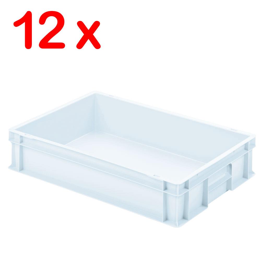Das fahrbare Regal ist mit 12 robusten Euro-Stapelboxen im Format 600x400x120 mm bestückt. Diese Eurobehälter überzeugen durch erstklassige Qualität. Die Kunststoffboxen sind die idealen Lager- und Transportbehälter für Industrie und Handwerk. Glatte Innenwände ermöglichen eine leichte und hygienische Reinigung der Boxen. Die Behälter sind extrem stabil und langlebig, spülmaschinenfest und gegen die meisten Chemikalien beständig. Kältebeständig bis -20°C, hitzebeständig bis +80°C.