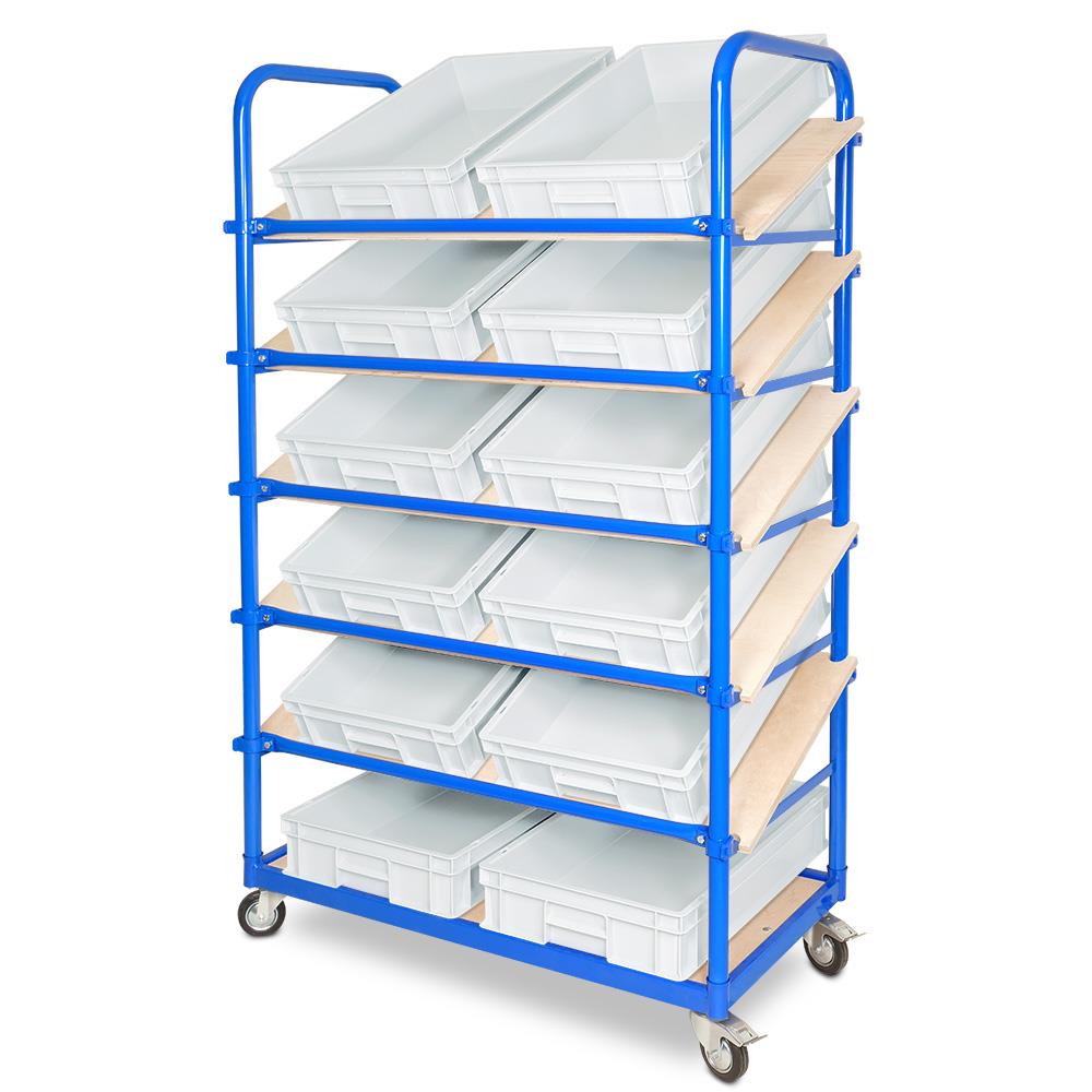Schrägboden-Regalwagen mit 6 Ebenen, BxTxH 1050x500x1690 mm, 4 Lenkrollen, 2 Rollen mit Feststellbremse, bestückt mit 12 Euroboxen BxTxH 600x400x120 mm, mit Griffleisten