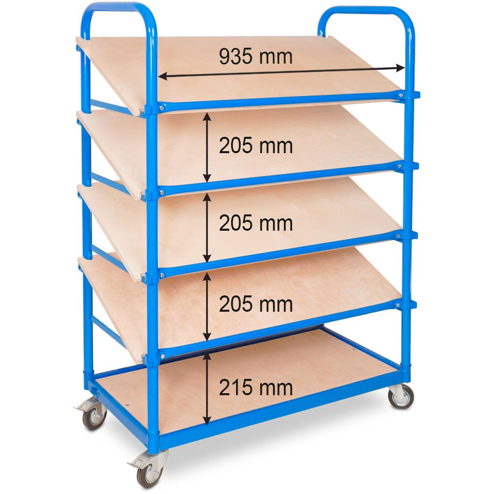 Der Kommissionierwagen verfügt über 5 Ebenen mit robusten, 15 mm starken und naturbelassenen Schichtholzladeflächen. Die geschweißte Stahlrohr- und Profilstahlkonstruktion ist hochwertig in der Farbe blau RAL 5010 kunststoffbeschichtet und schützt dadurch die Oberflächen vor den alltäglichen Belastungen des Betriebsalltags. Der Kommissionier- und Transportwagen hat 4 Lenkrollen mit leise laufenden Gummiräder, die eine einfache und sichere Handhabung ermöglichen. 2 Feststellbremsen gewährleisten auch im beladenen Zustand und Bodenneigungen einen sicheren Stand.