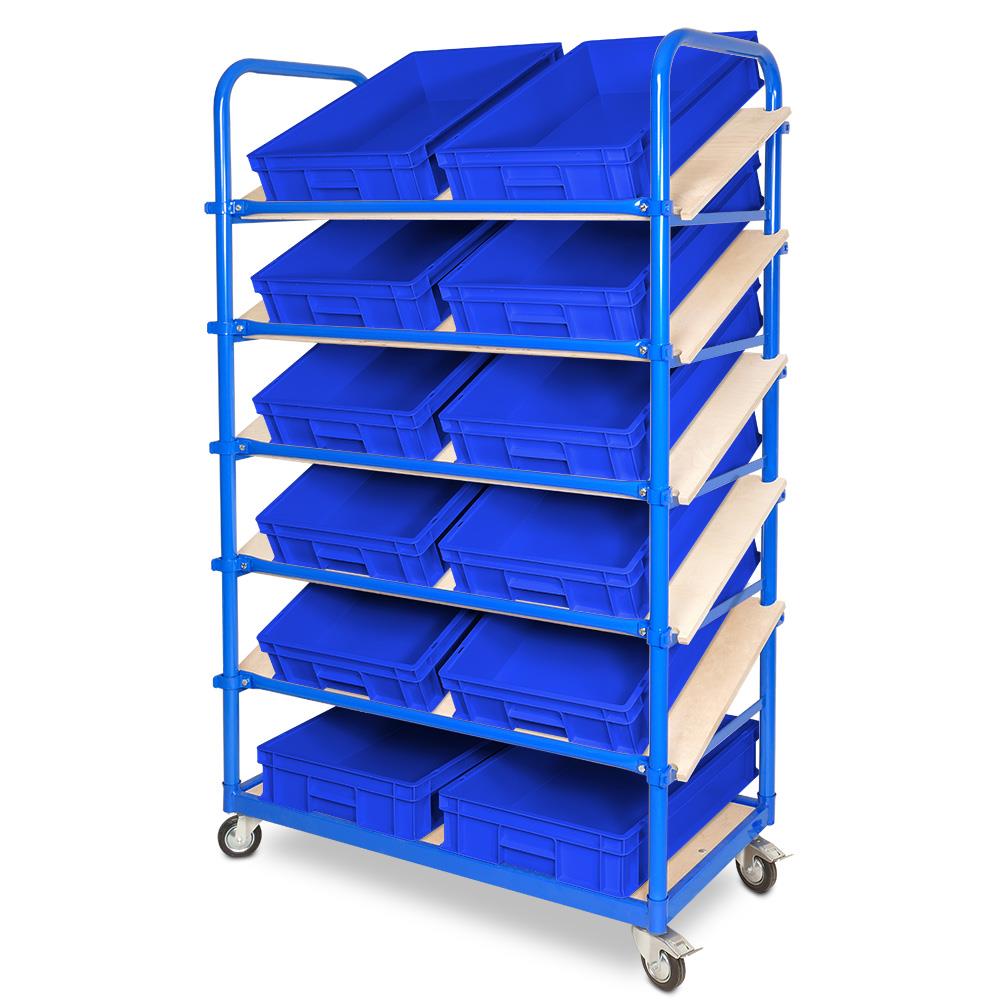 Schrägboden-Regalwagen mit 6 Ebenen, BxTxH 1050x500x1690 mm, 4 Lenkrollen, 2 Rollen mit Feststellbremse, bestückt mit 12 Euroboxen BxTxH 600x400x120 mm, mit Griffleisten