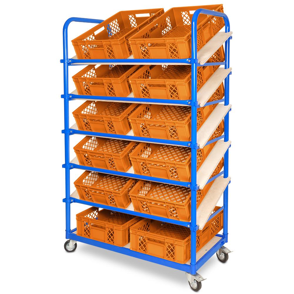 Dieser Schrägbodenregalwagen ist das ideale Transportmittel in Industriebereichen und für die Kommissionierung im Lager, wie auch für die Materialbereitstellung in der Montage bestens geeignet.