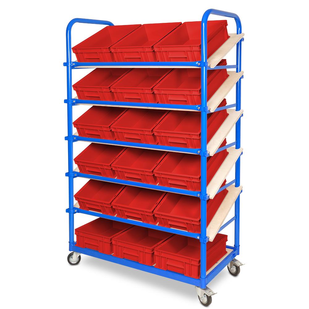 Dieser Schrägbodenregalwagen ist das ideale Transportmittel in Industriebereichen und für die Kommissionierung im Lager, wie auch für die Materialbereitstellung in der Montage bestens geeignet.
