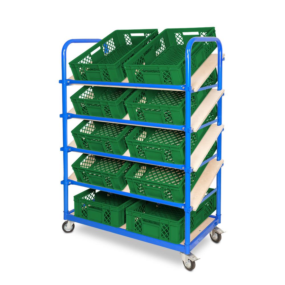 Dieser Schrägbodenregalwagen ist das ideale Transportmittel in Industriebereichen und für die Kommissionierung im Lager, wie auch für die Materialbereitstellung in der Montage bestens geeignet.