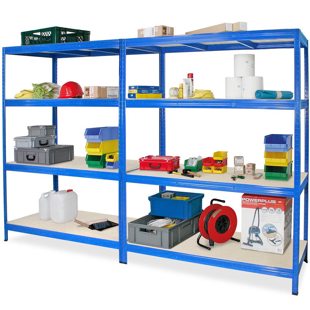 Sehr stabiles Stahl-Steckregal mit 8 Holzböden aus naturbelassenen Spanplatten, umlaufenden Stahl-Traversen und 2 Stahl-Unterzügen je Boden. Geteilte Regalstützen mit bodenschonenden Kunststofffüßen.