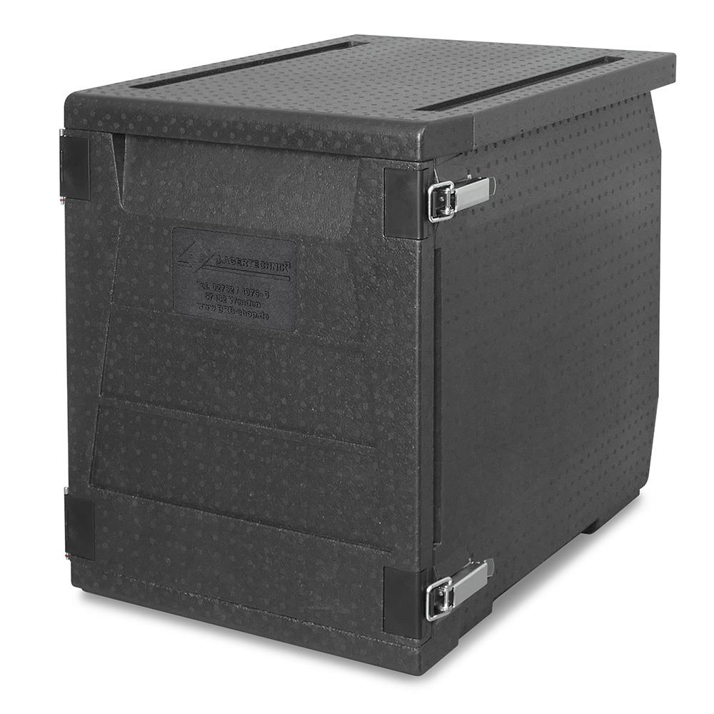 Frontlader Transport-Thermobox und Isolierbox mit Fronteinschub zum einfachen bestücken, Speisen gelangen sicher und optimal temperiert zu ihrem Bestimmungsort. Backbleche und Tabletts im Format 600x400 mm passen genau hinein. Insgesamt finden 11 Bleche mit einer Nutzhöhe von 34 mm je Blech darin Platz oder 10 Bleche und ein Kühl- oder Wärme-Akku.