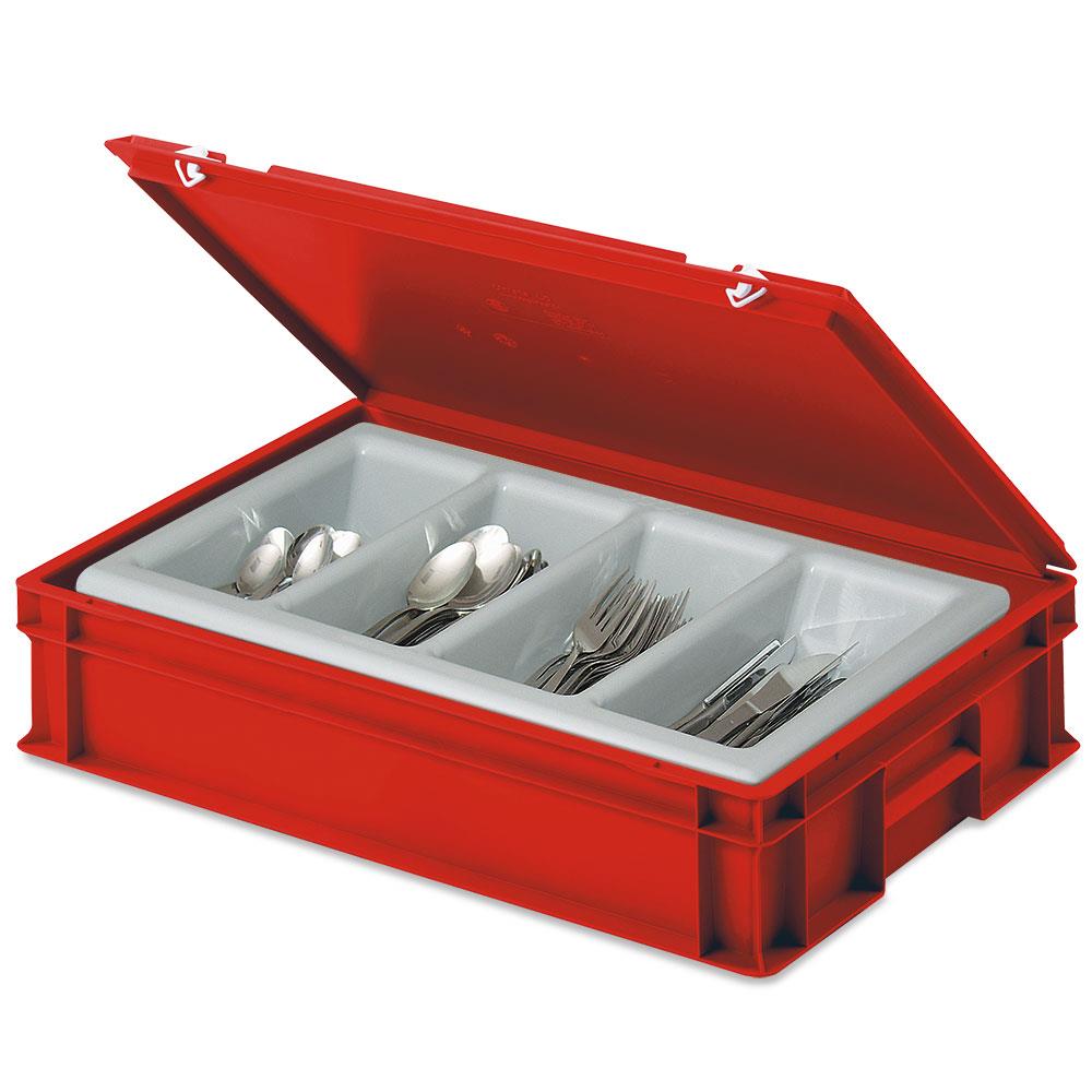 Besteckkasten mit Besteckeinsatz (4 Mulden), LxBxH 600x400x130 mm, rot