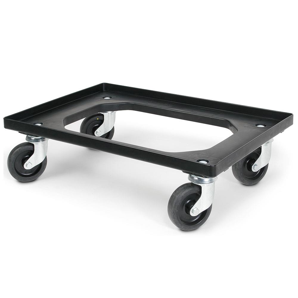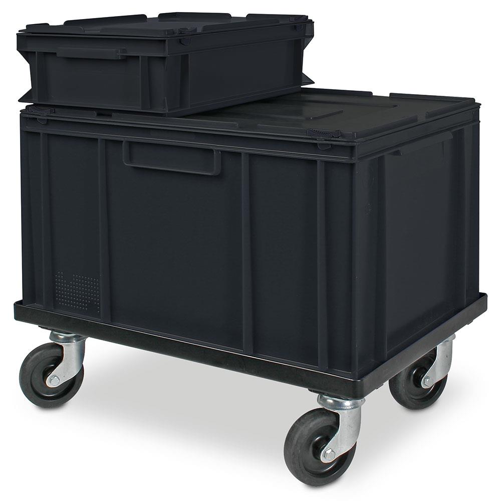 Hochwertiger und robuster ESD-Kistenroller / Logistikroller für Behälter, Euro-Boxen, Körbe und Kisten im Euro-Format 600x400 mm oder 2 x 400x300 mm. Der Roller wird aus elektrischleitfähigem ESD-PP-Kunststoff hergestellt und ist daher besonders für den sicheren Transport von elektronischer Ware geeignet.