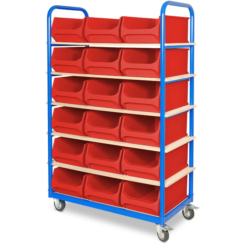 Etagenwagen mit 6 Ebenen, BxTxH 1050x500x1690 mm, 2 Lenk- (mit Feststellbremse) u. 2 Bockrollen, bestückt mit 18 roten Sichtboxen "LB 2"