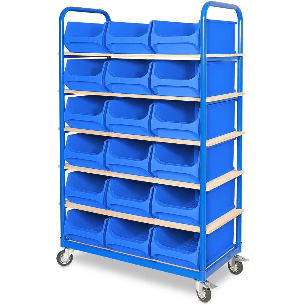 Etagenwagen mit 6 Ebenen, BxTxH 1050x500x1690 mm, 4 Lenkrollen, 2 Rollen mit Feststellbremse, bestückt mit 18 blauen Sichtboxen "LB 2"