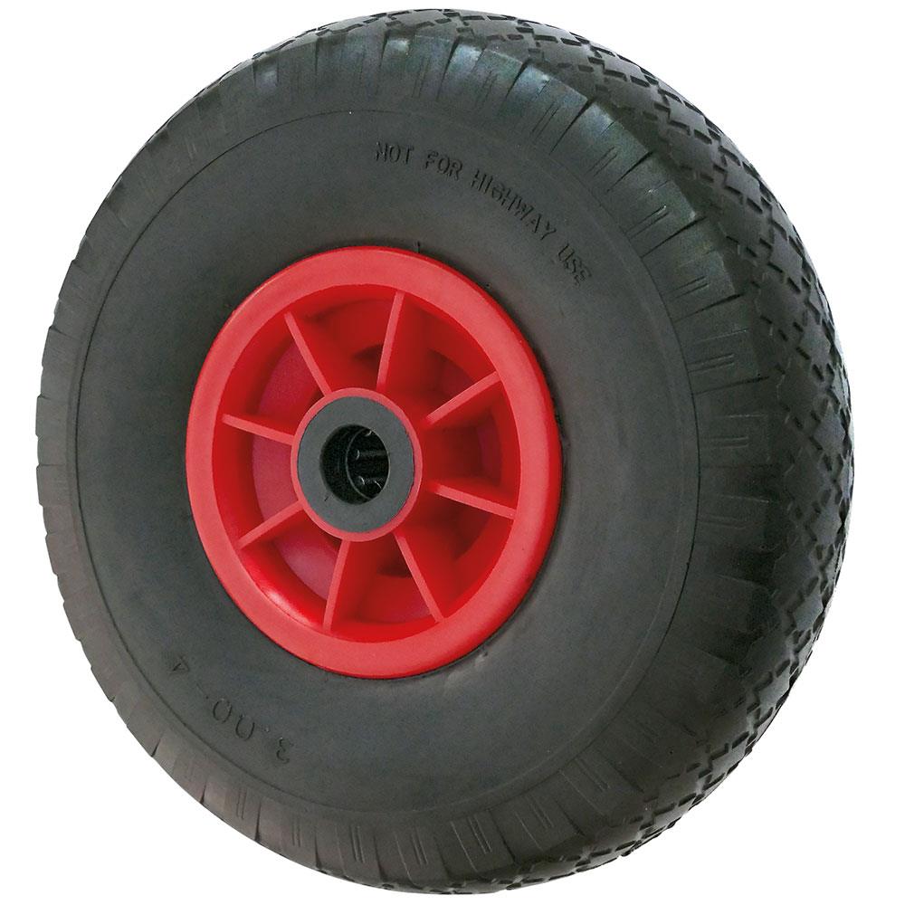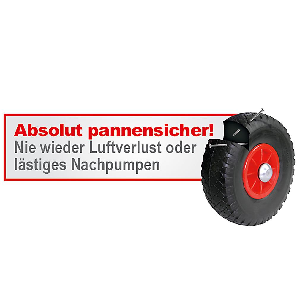 Pannensicheres Rad aus geschäumtem Polyurethan mit Stollenprofil und Kunststoff-Radkörper. Das Rad bietet einen sehr geringen Anfahrwiderstand auch bei schlechten Bodenverhältnissen.