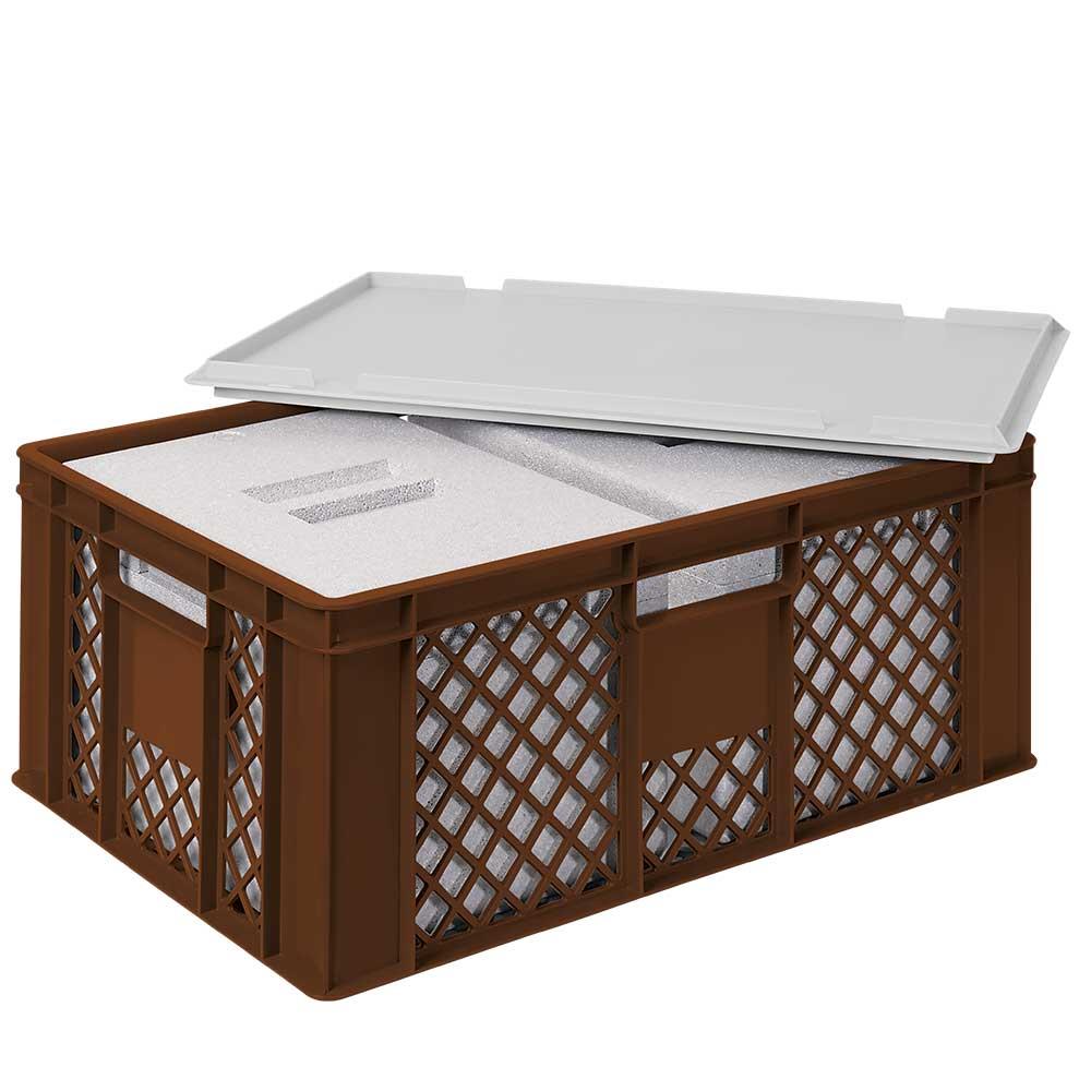 2 EPS-Thermoboxen im Stapelkorb mit Deckel, LxBxH 600x400x240 mm, brauner Korb, grauer Deckel
