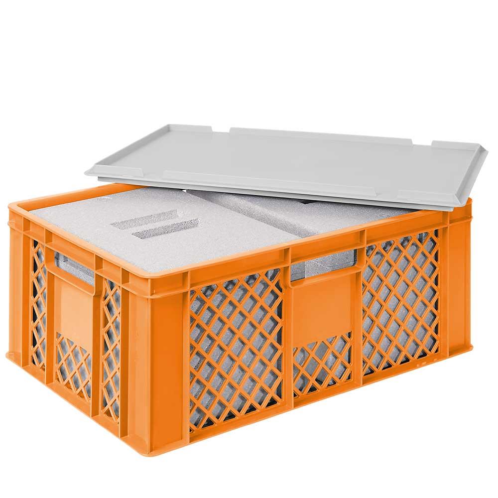 2 EPS-Thermoboxen im Stapelkorb mit Deckel, LxBxH 600x400x240 mm, orangener Korb, grauer Deckel