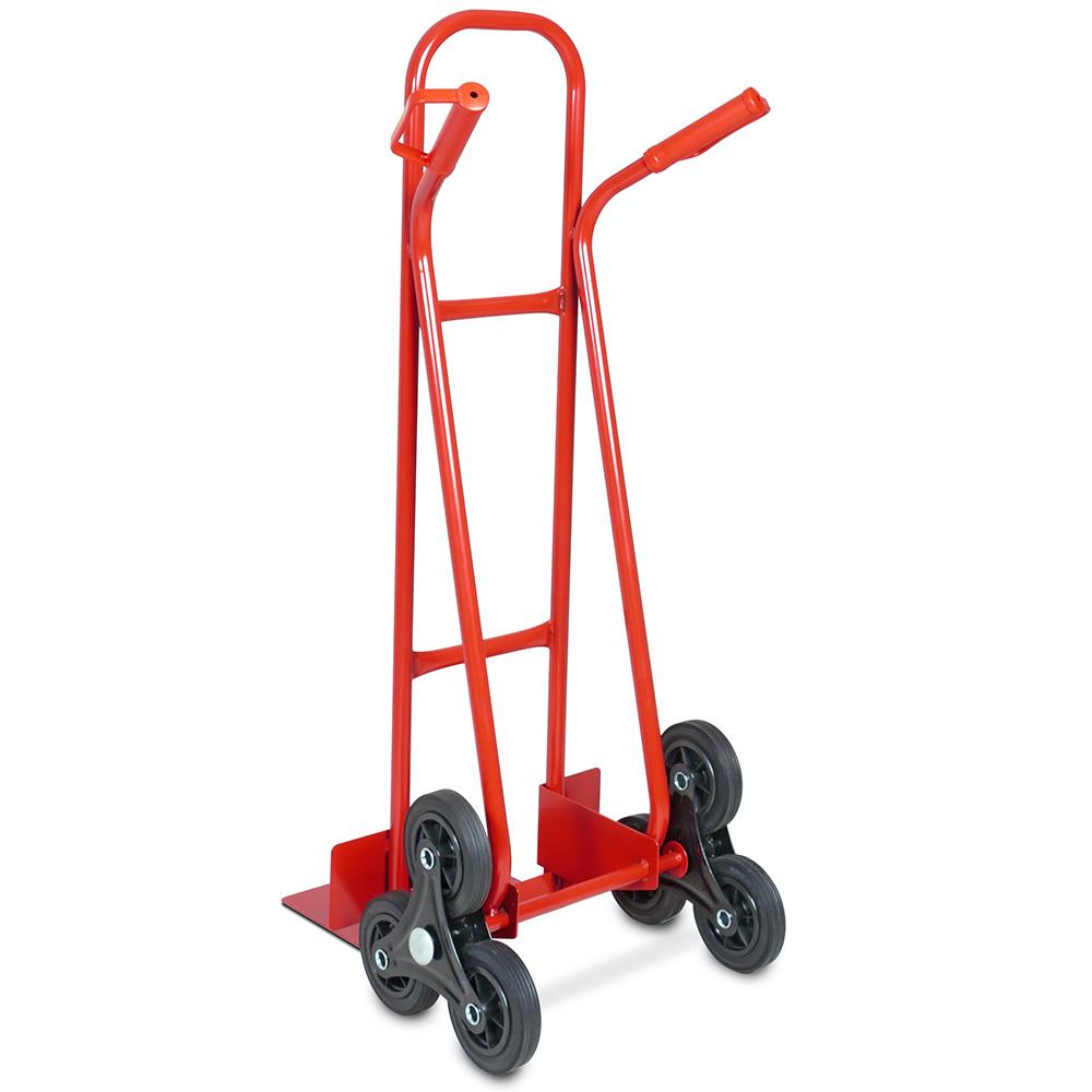 Sicherer Transport auf Treppen durch 3 sternförmig angeordnete Räder, Durchmesser 140x35 mm. Geschweißte Stahlrohr-Konstruktion mit Radschutz, in Farbe Feuerrot RAL 3000, kunststoffbeschichtet. Rote Sicherheitsgriffe mit Handschutzbügeln aus hochfestem Kunststoff.