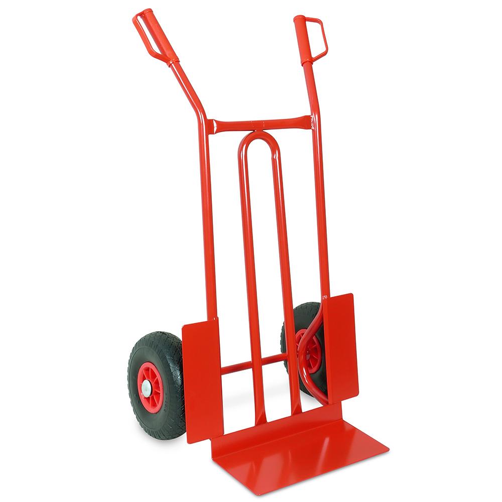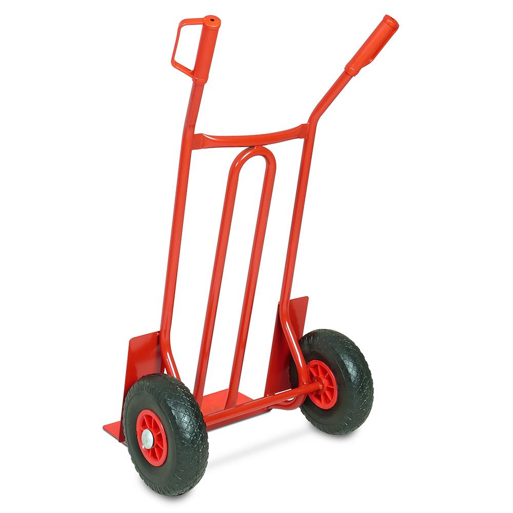 Für die Werkstatt, Lieferwagen, Lager… Stabiles Rohrgestell mit großer Schaufel für sicheren Halt der Waren. Farbe Feuerrot RAL 3000, kunststoffbeschichtet. Geschweißte Rohrkonstruktion mit Radschutz, 2 Sicherheitsgriffen und Handschutzbügeln aus hochfestem Kunststoff. Pannensichere Reifen mit griffigem Stollenprofil, Ø 260x80 mm.
