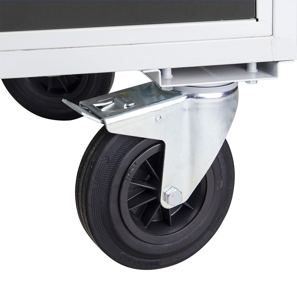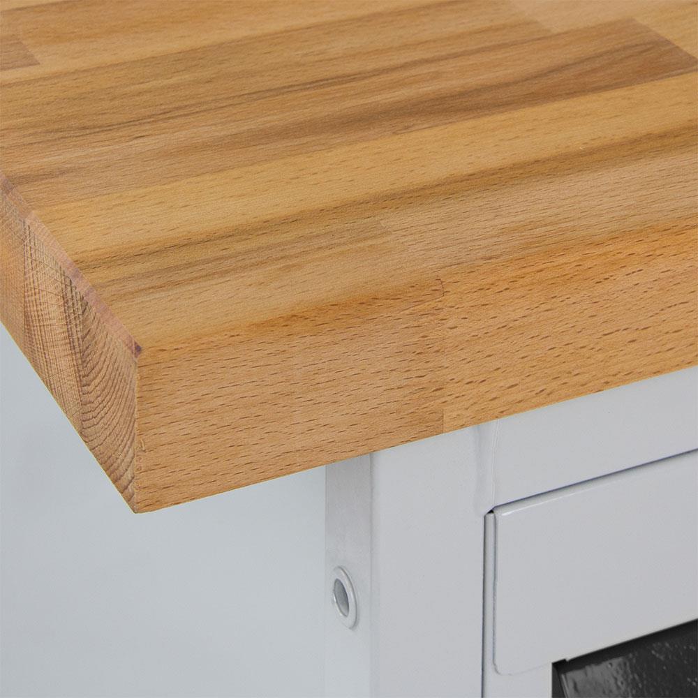 Die mobile und vielseitig einsetzbare Werkbank ist stabil gefertigt. Der komplett geschweißte Vierkant-Stahlrohrrahmen gewährleistet eine hohe Stabilität. Hinter der Tür befindet sich ein verzinkter Ablageboden. Die Ablagefläche mit Aufkantung (40 mm) bietet Platz für z. B. einen Werkzeugkoffer oder Geräte, die mehr Platz in der Höhe benötigen. Die 27 mm starke Arbeitsplatte besteht aus einer riegelartig verleimten und schutzlasierten Buchenplatte. Trotz des Gesamtgewichts der mobilen Werkbank von 95 kg, ist diese aufgrund der leichtgängigen Räder einfach zu bewegen. Mit einer Gesamttragfähigkeit von bis zu 500 kg, ist die Werkbank sowohl für Firmen als auch für Heimwerker geeignet. Die Lieferung erfolgt per Spedition.