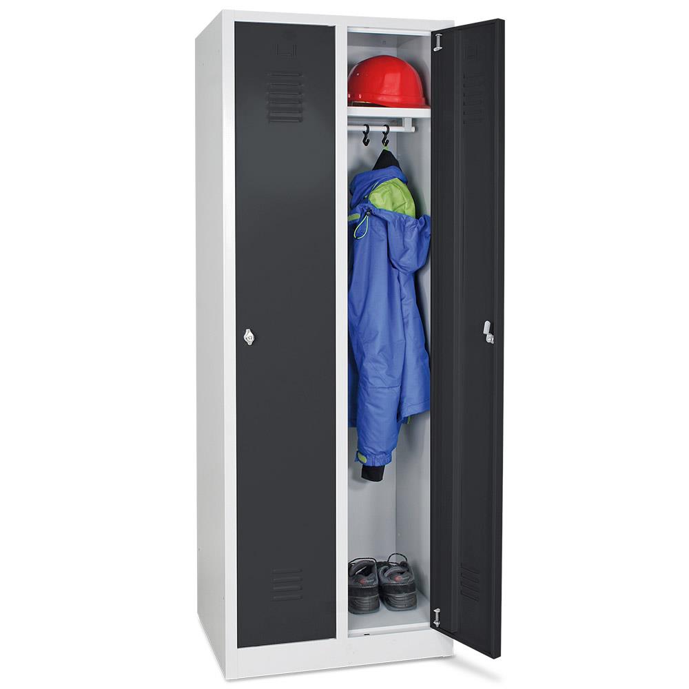 Stabiler, geschweißter Stahlblechspind, leicht und hygienisch zu reinigen. Hochwertig kunststoffbeschichtet in Farbe lichtgrau RAL 7035, Türen anthrazitgrau RAL 7016. Aus gekantetem und fest verschweißtem Stahlblech. Türen mit integrierter Verstärkung, innenliegenden Scharnieren, Lüftungsschlitzen und Drehriegelverschluss für Vorhängeschlösser. Je Abteil mit Hutboden, Kleiderstange und 2 Schiebehaken. Optional mit Schrägdachaufsatz, Sitzbankuntergestell und unterschraubbaren Schrankfüßen.