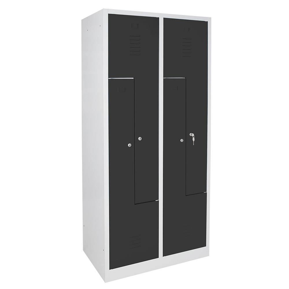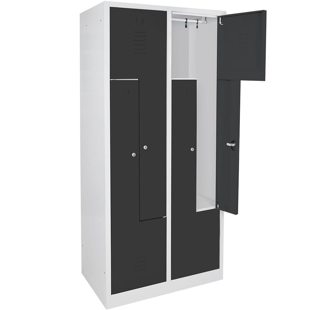 Stahl-Kleiderschrank in Z-Form, mehr Stauraum auf gleichem Platz - die Alternative zu Standard-Schränken. Stabile, extra verstärkte Türen mit Lüftungsschlitzen und innenliegenden Scharnieren. Abteile mit je einer Kleiderstange und 2 verschiebbaren Kleiderhaltern.