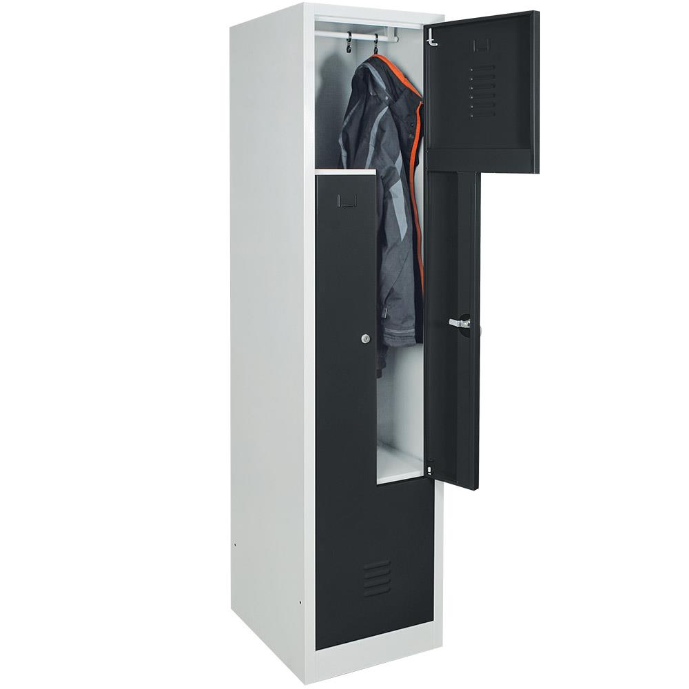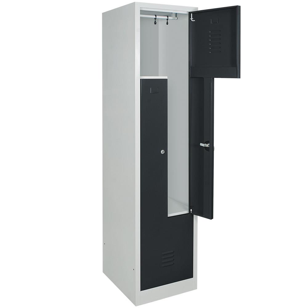 Stahl-Kleiderschrank in Z-Form, mehr Stauraum auf gleichem Platz - die Alternative zu Standard-Schränken. Stabile, extra verstärkte Türen mit Lüftungsschlitzen und innenliegenden Scharnieren. Abteile mit je einer Kleiderstange und 2 verschiebbaren Kleiderhaltern.