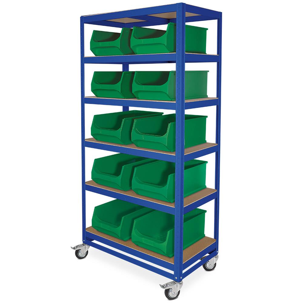 Kommissionierwagen mit 6 Ebenen, BxTxH 900x500x1905 mm, Tragkraft 200 kg, blau, bestückt mit 10 grünen Sichtboxen "LB 2"