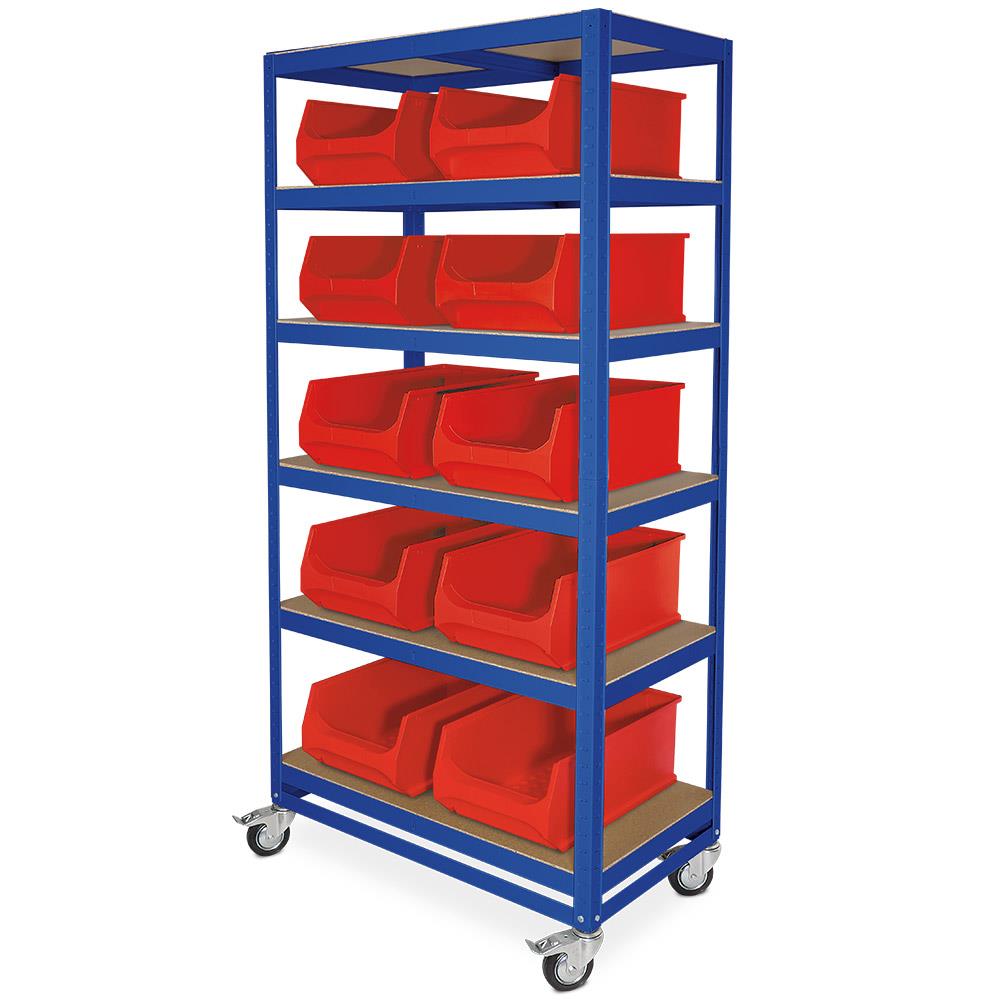 "Kommissionierwagen mit 6 Ebenen, BxTxH 900x500x1905 mm, Tragkraft 200 kg, blau, bestückt mit 10 roten Sichtboxen "LB 2""