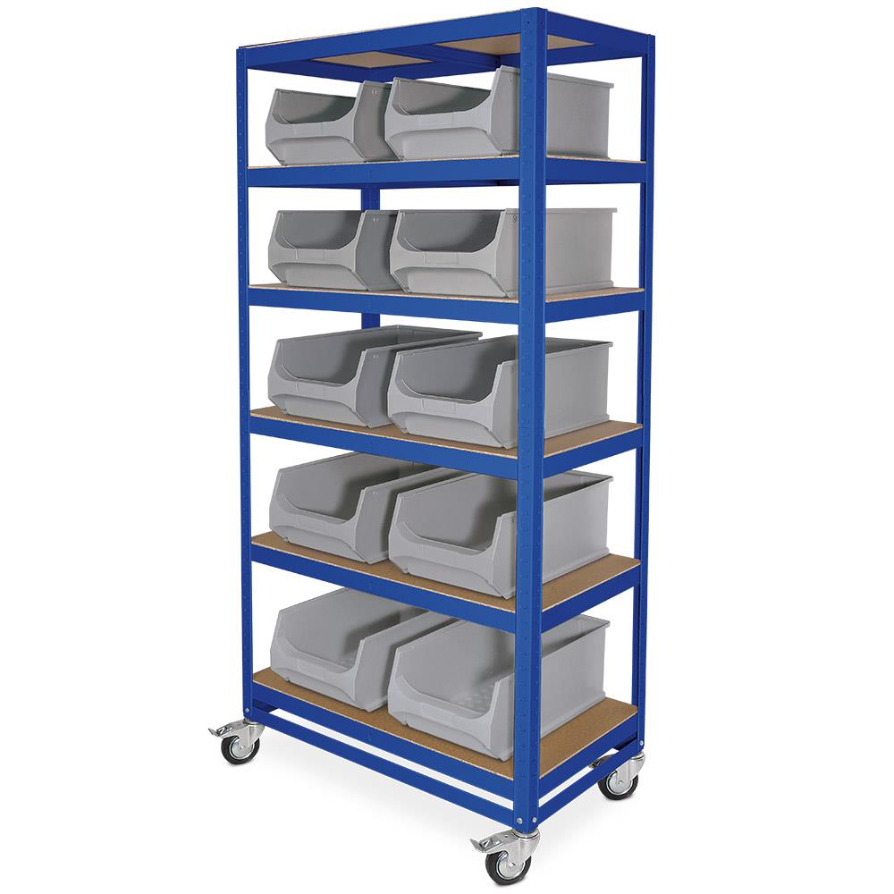 Kommissionierwagen mit 6 Ebenen, BxTxH 900x500x1905 mm, Tragkraft 200 kg, blau, bestückt mit 10 grauen Sichtboxen "LB 2"