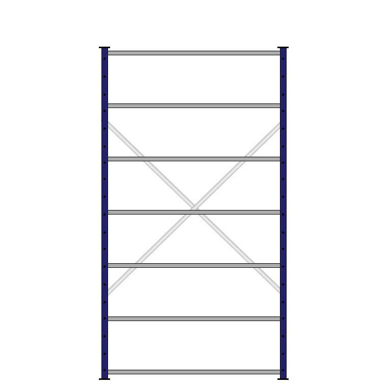 Doppelseitige Ausführung. Oberfläche kunststoffbeschichtet, Stützen enzianblau RAL 5010, Böden lichtgrau RAL 7035. Platz für 210 breite DIN A4-Ordner.