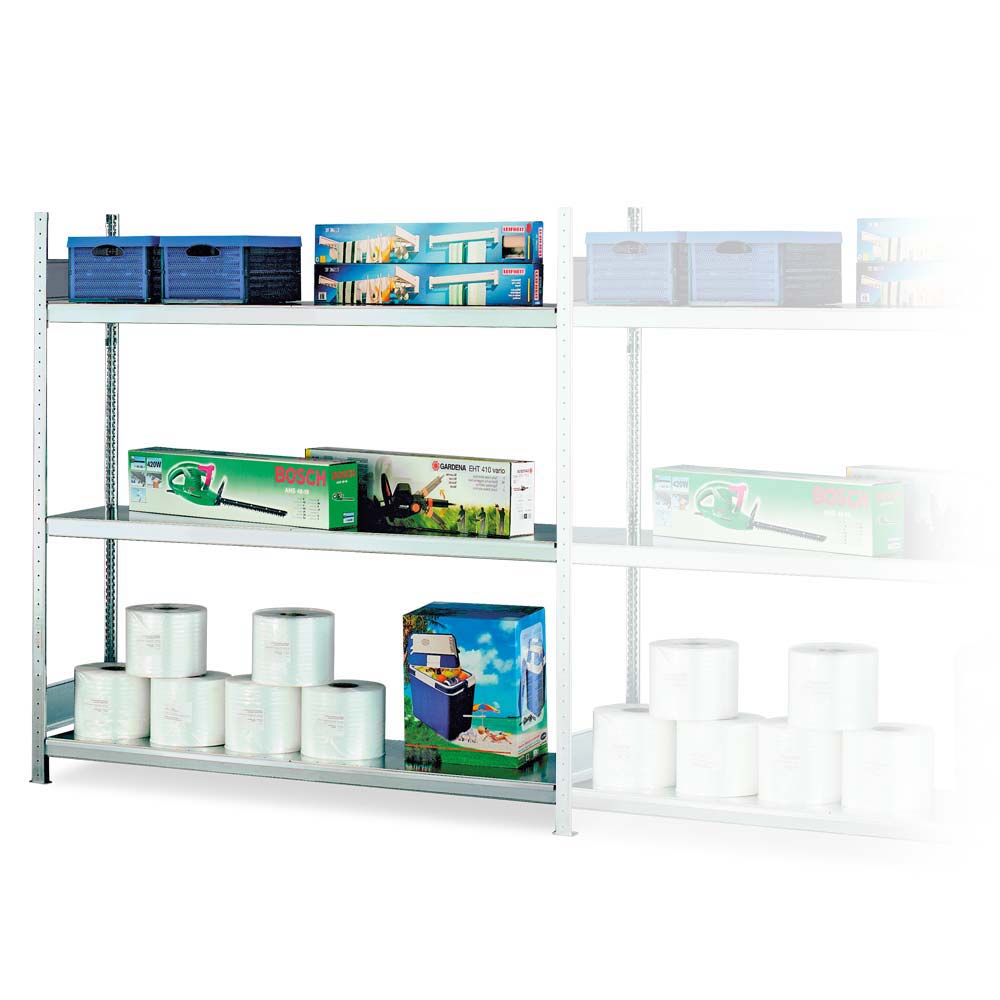 Weitespann-Anbauregal mit 3 Stahlbodenebenen, Stecksystem, glanzverzinkt, BxTxH 2006 x 435 x 2000 mm