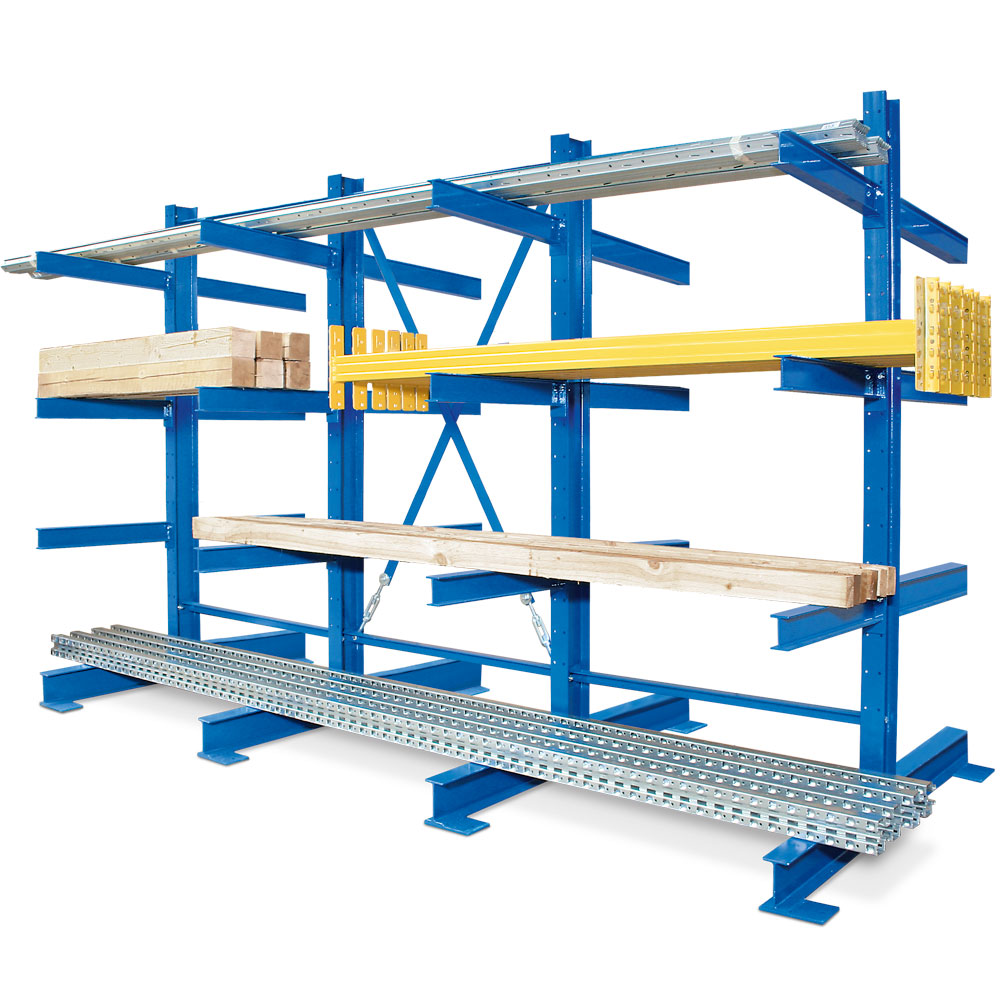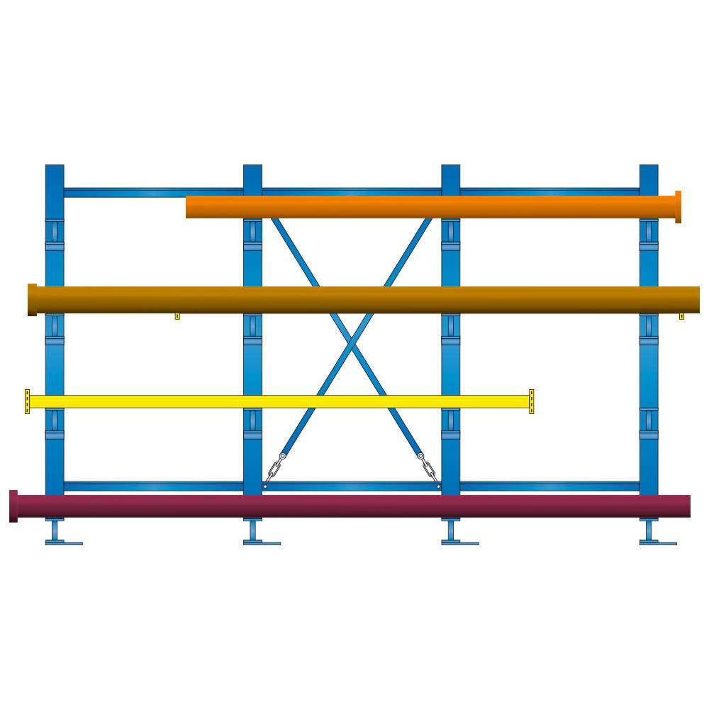 Die Arme des Kragarmregals sind im Raster von 100 mm flexibel höhenverstellbar. Die Verbindung der Ständer erfolgt durch Längs- und Diagonalverstrebungen.