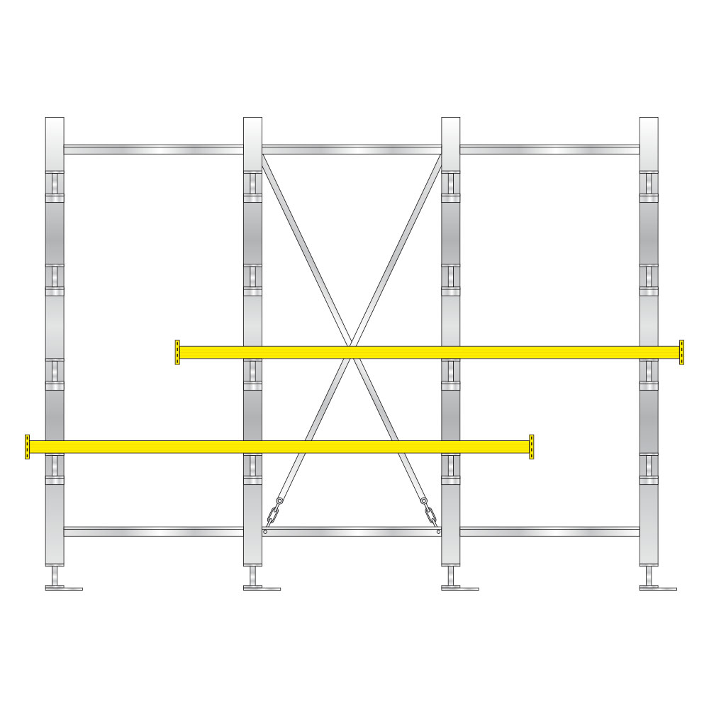 Die Arme des Kragarmregals sind im Raster von 100 mm flexibel höhenverstellbar. Die Verbindung der Ständer erfolgt durch Längs- und Diagonalverstrebungen. Der Aufbau erfolgt durch Schraubmontage. Inklusive Bodendübel/Bolzenanker.