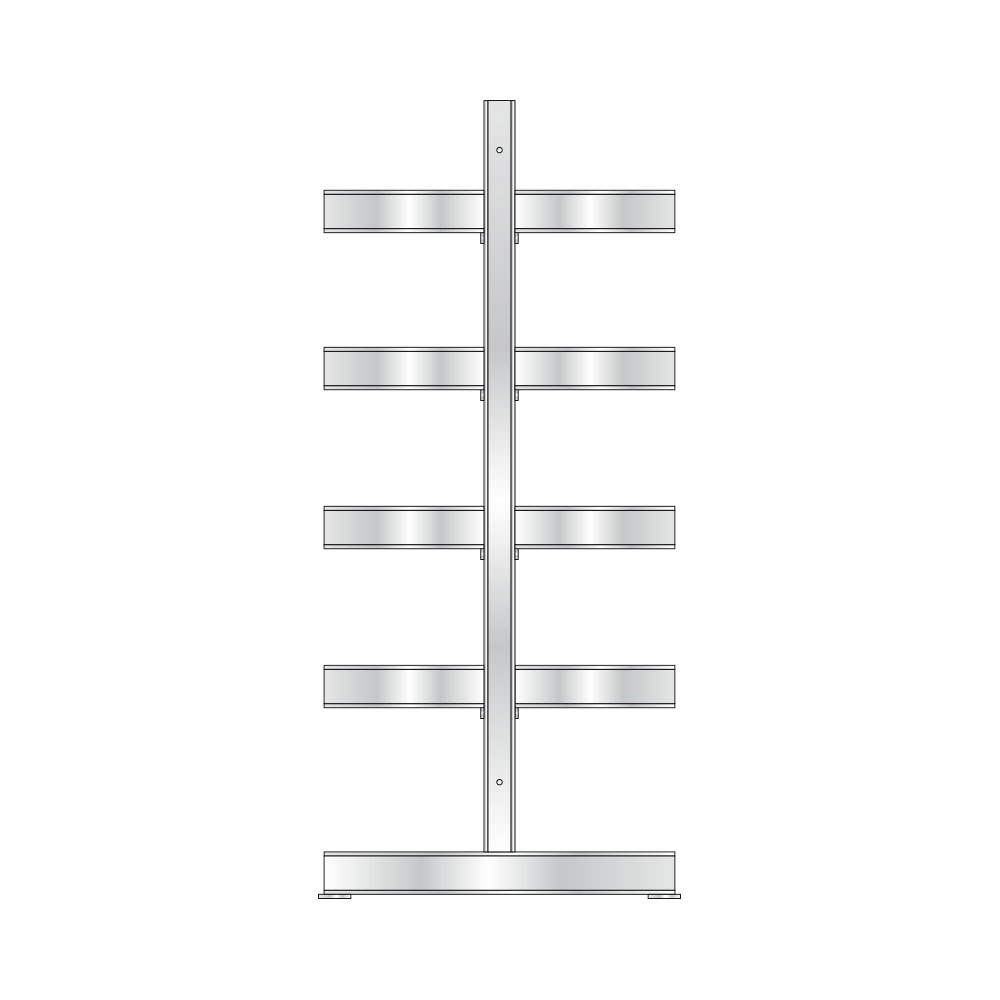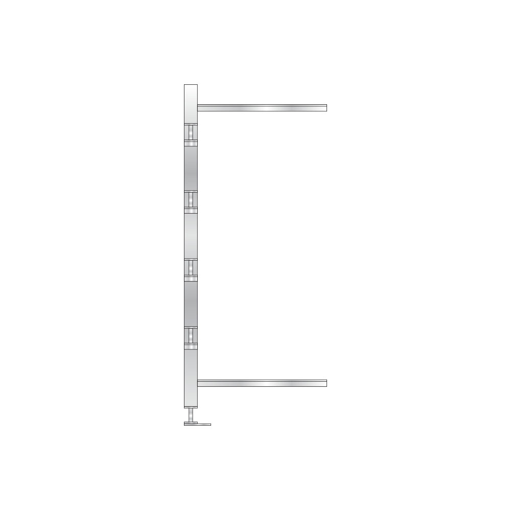 Die Arme des Kragarmregals sind im Raster von 100 mm flexibel höhenverstellbar. Die Verbindung der Ständer erfolgt durch Längs- und Diagonalverstrebungen. Der Aufbau erfolgt durch Schraubmontage. Inklusive Bodendübel/Bolzenanker.