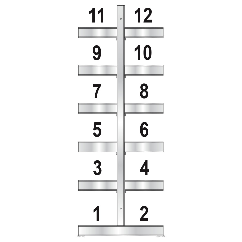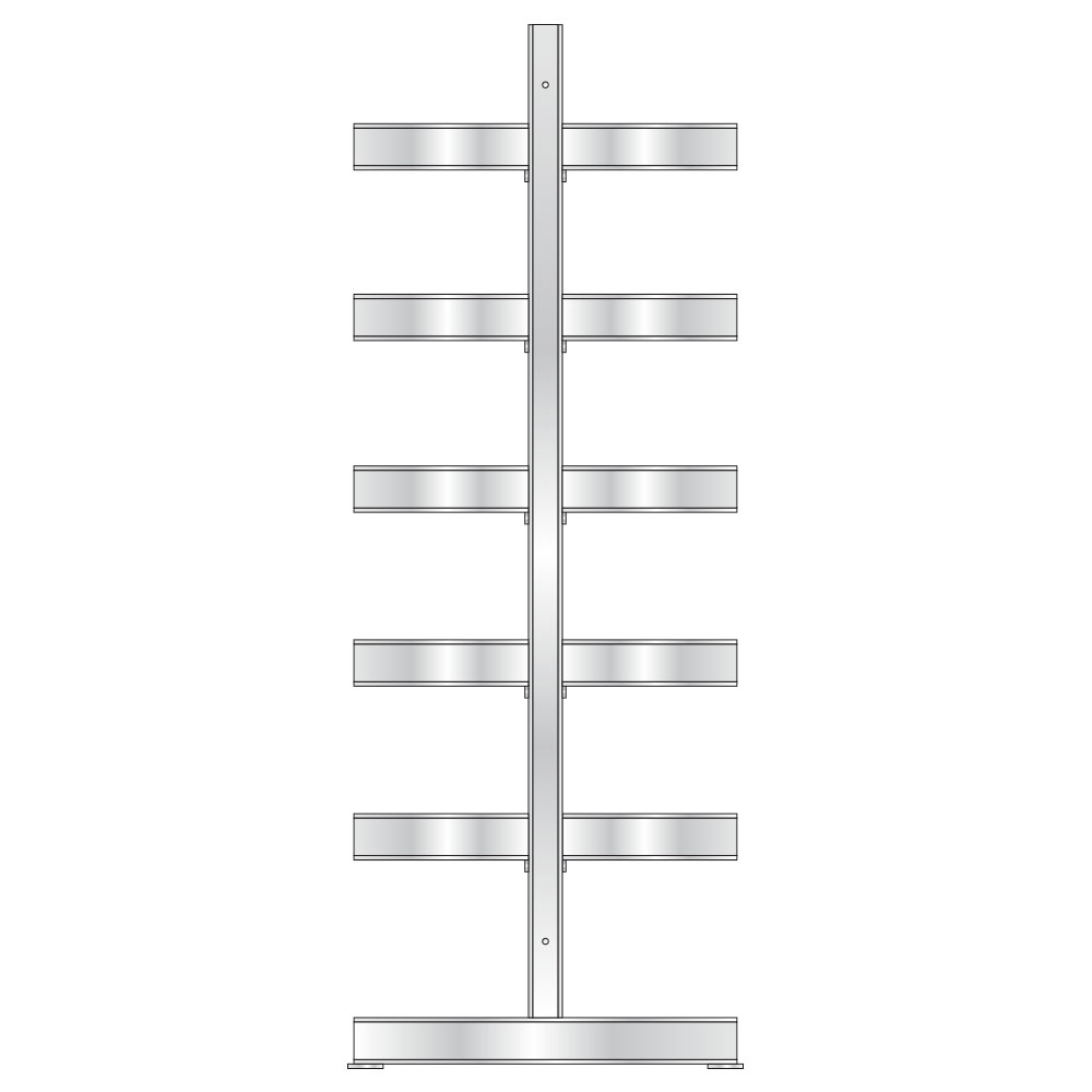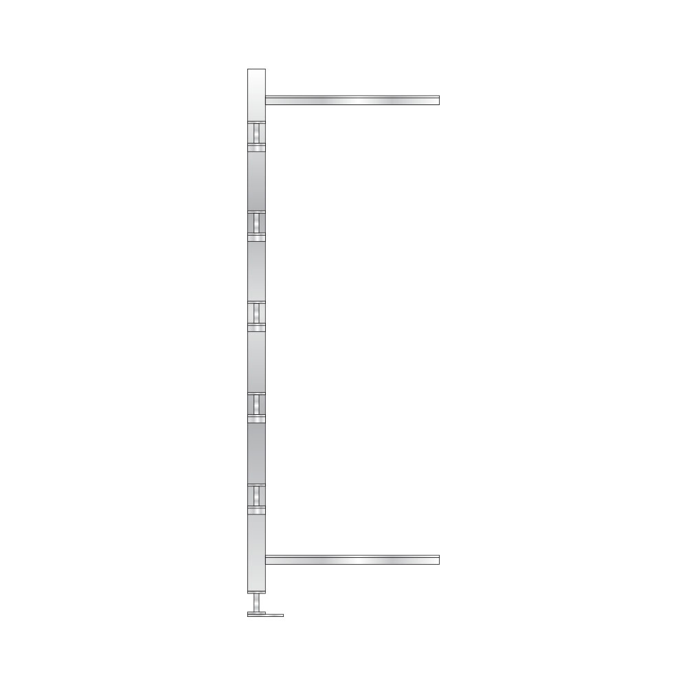 Die Arme des Kragarmregals sind im Raster von 100 mm flexibel höhenverstellbar. Die Verbindung der Ständer erfolgt durch Längs- und Diagonalverstrebungen. Der Aufbau erfolgt durch Schraubmontage. Inklusive Bodendübel/Bolzenanker.
