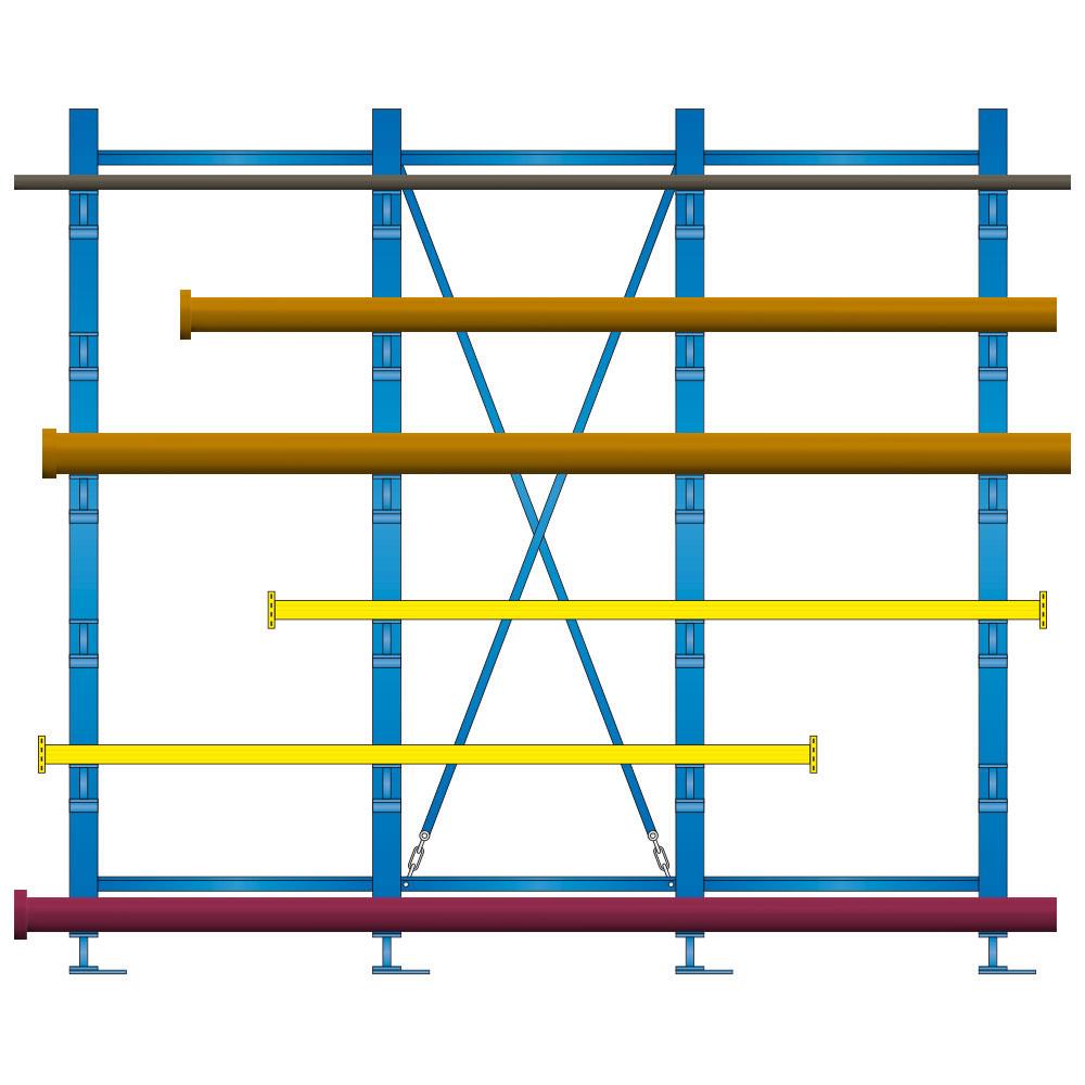 Die Arme des Kragarmregals sind im Raster von 100 mm flexibel höhenverstellbar. Die Verbindung der Ständer erfolgt durch Längs- und Diagonalverstrebungen. Der Aufbau erfolgt durch Schraubmontage. Inklusive Bodendübel/Bolzenanker.