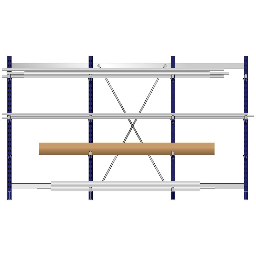 Leichte Ausführung für einseitige Nutzung. Ständer aus warmgewalzten IPE-Profilen, Arme aus hochfestem Stahl geformt. Die Kragarme sind im Raster von 60 mm einsteckbar, einfach einhängen - fertig. Die Ständerfußebenen sind uneingeschränkt belastbar. Oberfläche hochwertig kunststoffbeschichtet, enzianblau RAL 5010. Diagonalkreuze und Kleinteile verzinkt. Die Lieferung erfolgt mit 60 mm hohen Abrollsicherungen.