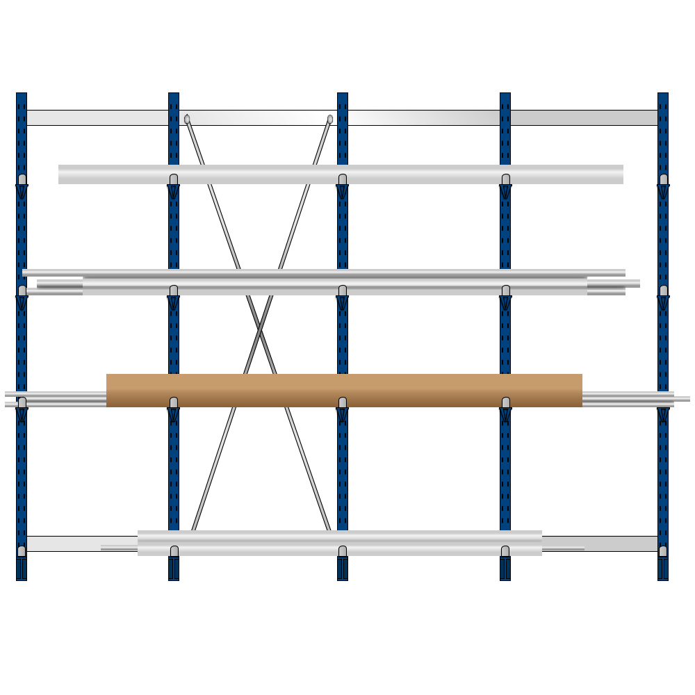 Leichte Ausführung für einseitige Nutzung. Ständer aus warmgewalzten IPE-Profilen, Arme aus hochfestem Stahl geformt. Die Kragarme sind im Raster von 60 mm einsteckbar, einfach einhängen - fertig. Die Ständerfußebenen sind uneingeschränkt belastbar. Oberfläche hochwertig kunststoffbeschichtet, enzianblau RAL 5010. Diagonalkreuze und Kleinteile verzinkt. Die Lieferung erfolgt mit 60 mm hohen Abrollsicherungen.