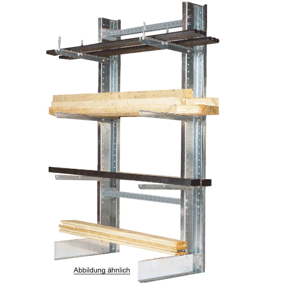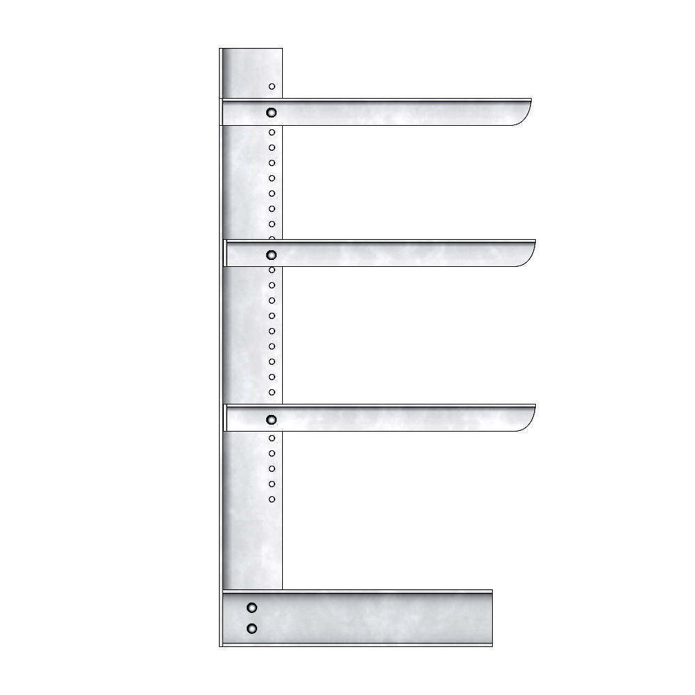 Einseitige Ausführung. Übersichtliche und leichte Zugänglichkeit zum Lagergut. Bequeme und schnelle Ein- und Auslagerung. Leichtes Verändern der Fachhöhen im Raster von 50 mm durch einfache Schraubmontage. Regalständer, Querträger, Arme und Fachböden glanzverzinkt. Die Stützenprofile sind aus hochfestem Stahl geformt und erhalten durch ihre spezielle Profilierung eine sehr hohe Steifigkeit
