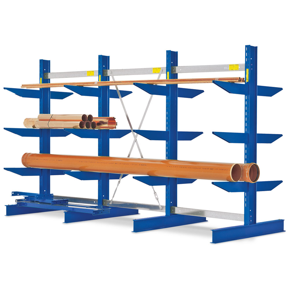 Schwere Ausführung, für doppelseitige Nutzung. Ständer aus warmgewalzten IPE 140-Profilen, Arme aus hochfestem Stahl geformt. Die Kragarme sind im Raster von 60 mm einsteckbar, einfach einhängen - fertig. Die Ständerfußebenen sind uneingeschränkt belastbar. Oberfläche hochwertig kunststoffbeschichtet, enzianblau RAL 5010. Diagonalkreuze und Kleinteile verzinkt.