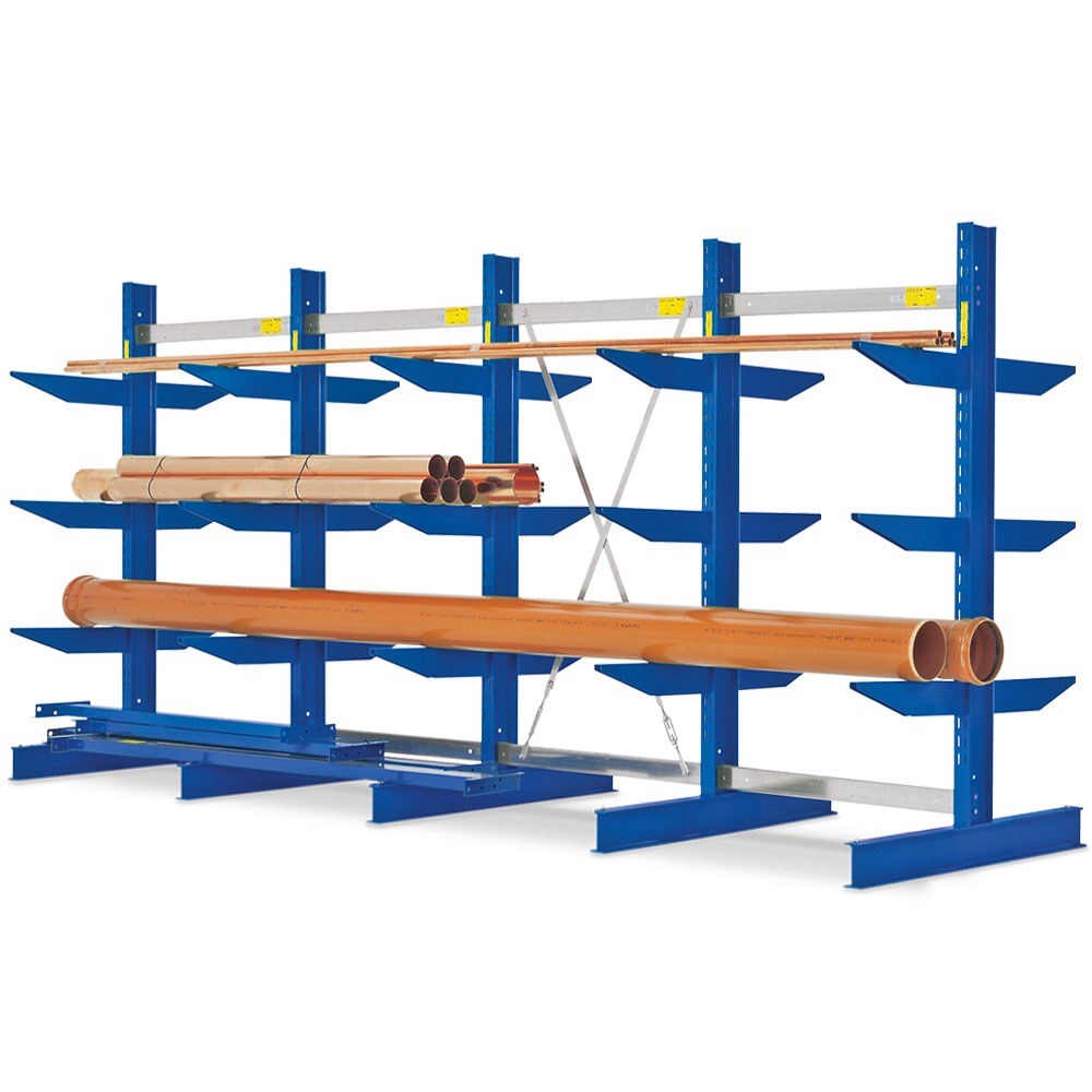 Schwere Ausführung, für doppelseitige Nutzung. Ständer aus warmgewalzten IPE 140-Profilen, Arme aus hochfestem Stahl geformt. Die Kragarme sind im Raster von 60 mm einsteckbar, einfach einhängen - fertig. Die Ständerfußebenen sind uneingeschränkt belastbar. Oberfläche hochwertig kunststoffbeschichtet, enzianblau RAL 5010. Diagonalkreuze und Kleinteile verzinkt