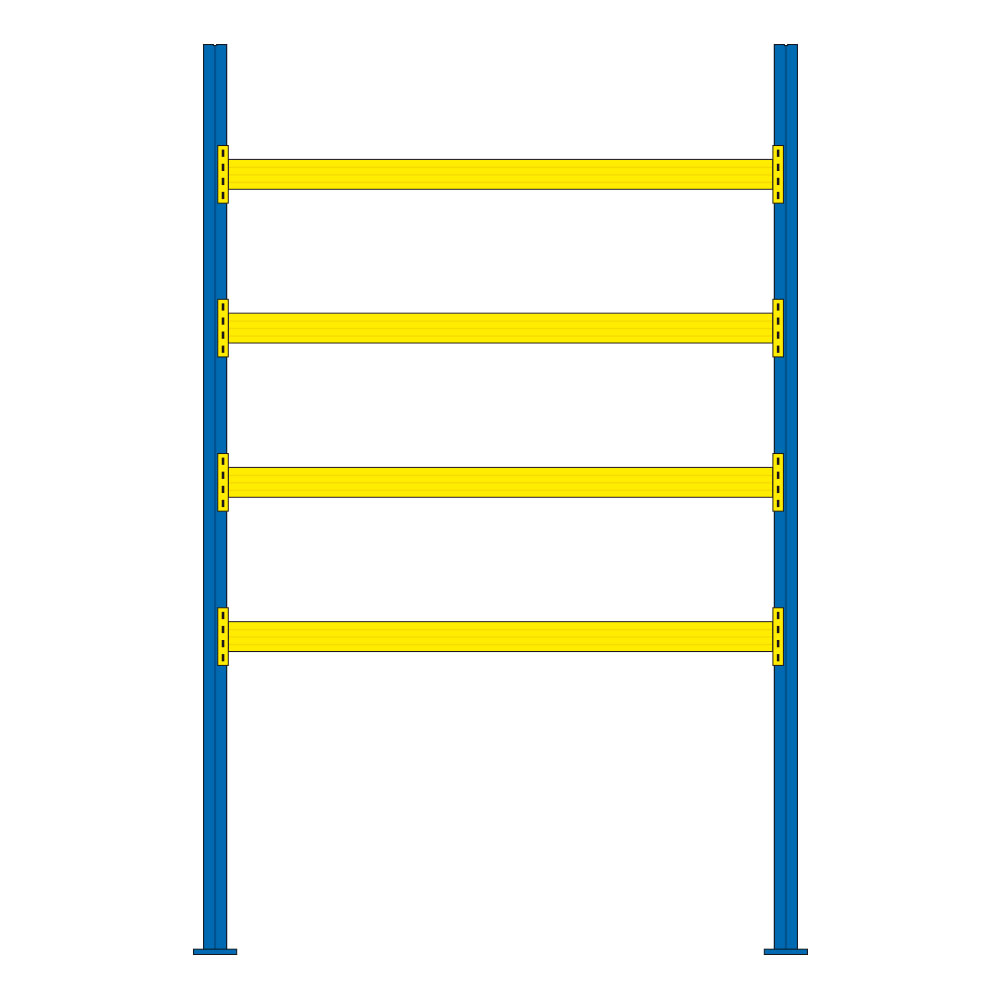 Praktisches Großfachregal für Paletten, Gitterboxen und Behälter. Mit diesem Regalsystem steht Ihnen ein leistungsstarkes und praxisbewährtes Produkt zur Auswahl. Die Stützenprofile sind aus hochfestem Stahl geformt und erhalten durch ihre spezielle Profilierung eine sehr hohe Steifigkeit. Sie werden durch Diagonal- und Horizontalstreben zu einem Fachwerkrahmen verschraubt. Die Anlieferung bei Ihnen erfolgt zerlegt. Die steckbaren Tragbalken gewährleisten eine einfache und schnelle Montage und kurze Umbauzeiten. Sie sind auch nachträglich im Raster von 50 mm in der Höhe verstellbar. Das praxisgerechte Zubehör ermöglicht den betrieblichen Erfordernissen leicht anpassbare Lösungen. Dieses Regalsystem ist mit allen Stapelgeräten bedienbar. Regalstützen blau RAL 5010, Fachwerk verzinkt, Tragbalken goldgelb RAL 1004 kunststoffbeschichtet.