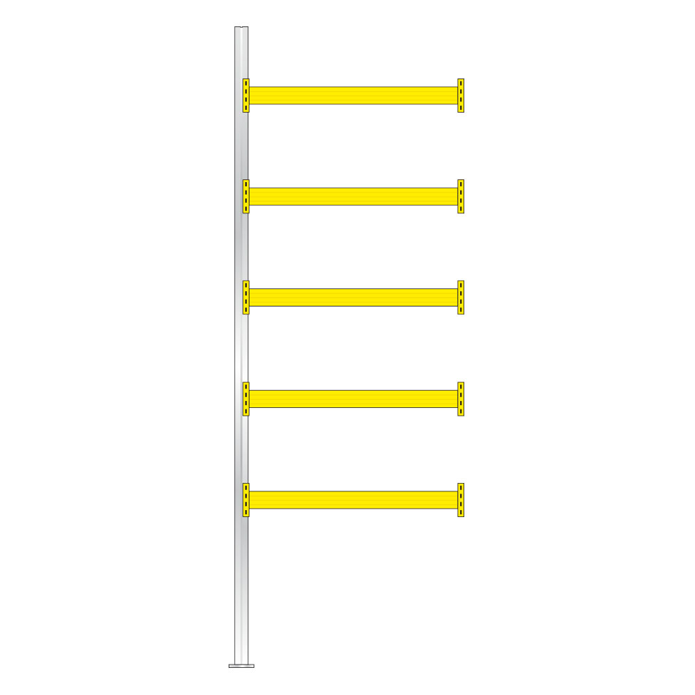 Praktische Großfachregale für Paletten, Gitterboxen und Behälter. Mit diesem Regalsystem steht Ihnen ein leistungsstarkes und praxisbewährtes Produkt zur Auswahl. Die Stützenprofile sind aus hochfestem Stahl geformt und erhalten durch ihre spezielle Profilierung eine sehr hohe Steifigkeit. Sie werden durch Diagonal- und Horizontalstreben zu einem Fachwerkrahmen verschraubt. Die Anlieferung bei Ihnen erfolgt zerlegt. Die steckbaren Tragbalken gewährleisten eine einfache und schnelle Montage und kurze Umbauzeiten. Sie sind auch nachträglich im Raster von 50 mm in der Höhe verstellbar. Das praxisgerechte Zubehör ermöglicht den betrieblichen Erfordernissen leicht anpaßbare Lösungen. Dieses Regalsystem ist mit allen Stapelgeräten bedienbar. Regalstützen und Fachwerk glanzverzinkt, Tragbalken goldgelb RAL 1004 kunststoffbeschichtet, inkl. Bolzenanker.