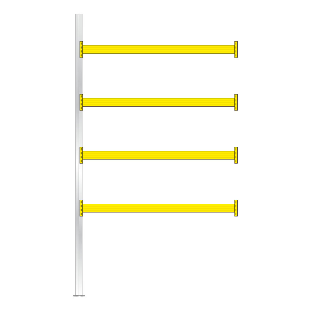 Praktische Großfachregale für Paletten, Gitterboxen und Behälter. Mit diesem Regalsystem steht Ihnen ein leistungsstarkes und praxisbewährtes Produkt zur Auswahl. Die Stützenprofile sind aus hochfestem Stahl geformt und erhalten durch ihre spezielle Profilierung eine sehr hohe Steifigkeit. Sie werden durch Diagonal- und Horizontalstreben zu einem Fachwerkrahmen verschraubt. Die Anlieferung bei Ihnen erfolgt zerlegt. Die steckbaren Tragbalken gewährleisten eine einfache und schnelle Montage und kurze Umbauzeiten. Sie sind auch nachträglich im Raster von 50 mm in der Höhe verstellbar. Das praxisgerechte Zubehör ermöglicht den betrieblichen Erfordernissen leicht anpaßbare Lösungen. Dieses Regalsystem ist mit allen Stapelgeräten bedienbar. Regalstützen und Fachwerk glanzverzinkt, Tragbalken goldgelb RAL 1004 kunststoffbeschichtet, inkl. Bolzenanker.