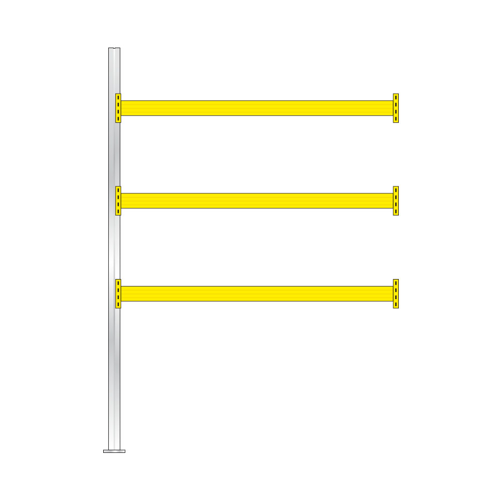 Praktische Großfachregale für Paletten, Gitterboxen und Behälter. Mit diesem Regalsystem steht Ihnen ein leistungsstarkes und praxisbewährtes Produkt zur Auswahl. Die Stützenprofile sind aus hochfestem Stahl geformt und erhalten durch ihre spezielle Profilierung eine sehr hohe Steifigkeit. Sie werden durch Diagonal- und Horizontalstreben zu einem Fachwerkrahmen verschraubt. Die Anlieferung bei Ihnen erfolgt zerlegt. Die steckbaren Tragbalken gewährleisten eine einfache und schnelle Montage und kurze Umbauzeiten. Sie sind auch nachträglich im Raster von 50 mm in der Höhe verstellbar. Das praxisgerechte Zubehör ermöglicht den betrieblichen Erfordernissen leicht anpaßbare Lösungen. Dieses Regalsystem ist mit allen Stapelgeräten bedienbar. Regalstützen und Fachwerk glanzverzinkt, Tragbalken goldgelb RAL 1004 kunststoffbeschichtet, inkl. Bolzenanker.
