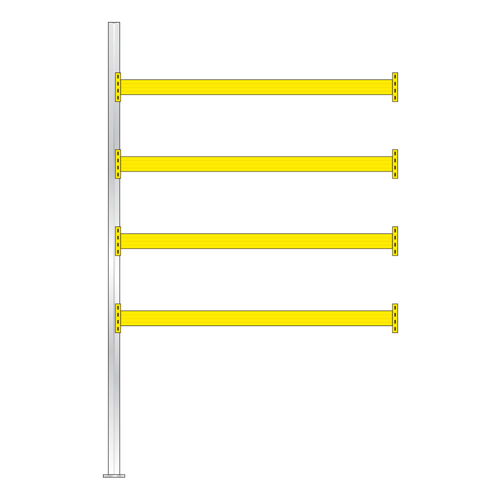 Praktische Großfachregale für Paletten, Gitterboxen und Behälter. Mit diesem Regalsystem steht Ihnen ein leistungsstarkes und praxisbewährtes Produkt zur Auswahl. Die Stützenprofile sind aus hochfestem Stahl geformt und erhalten durch ihre spezielle Profilierung eine sehr hohe Steifigkeit. Sie werden durch Diagonal- und Horizontalstreben zu einem Fachwerkrahmen verschraubt. Die Anlieferung bei Ihnen erfolgt zerlegt. Die steckbaren Tragbalken gewährleisten eine einfache und schnelle Montage und kurze Umbauzeiten. Sie sind auch nachträglich im Raster von 50 mm in der Höhe verstellbar. Das praxisgerechte Zubehör ermöglicht den betrieblichen Erfordernissen leicht anpaßbare Lösungen. Dieses Regalsystem ist mit allen Stapelgeräten bedienbar. Regalstützen und Fachwerk glanzverzinkt, Tragbalken goldgelb RAL 1004 kunststoffbeschichtet, inkl. Bolzenanker.