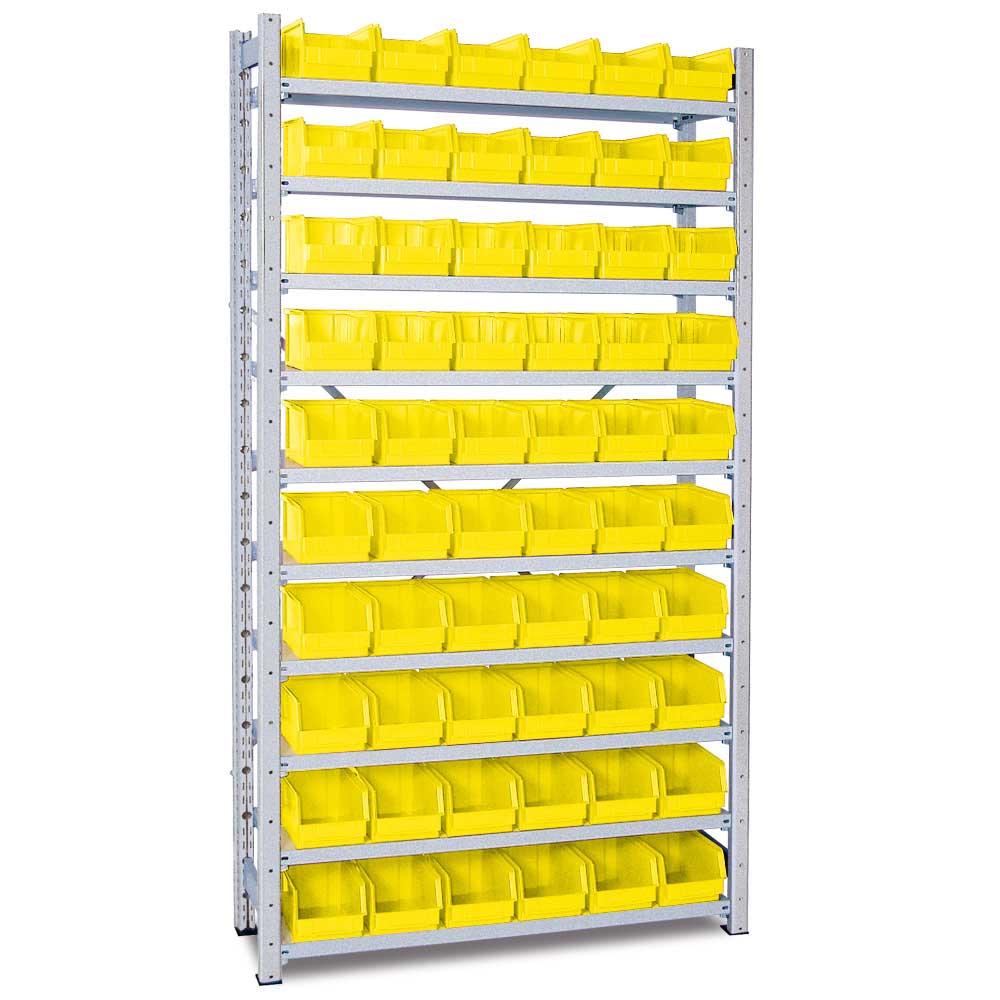 Steckregal, verzinkt, BxTxH 1070x315x2000 mm, 10 Böden, 60 Sichtboxen LB 4 Farbe gelb