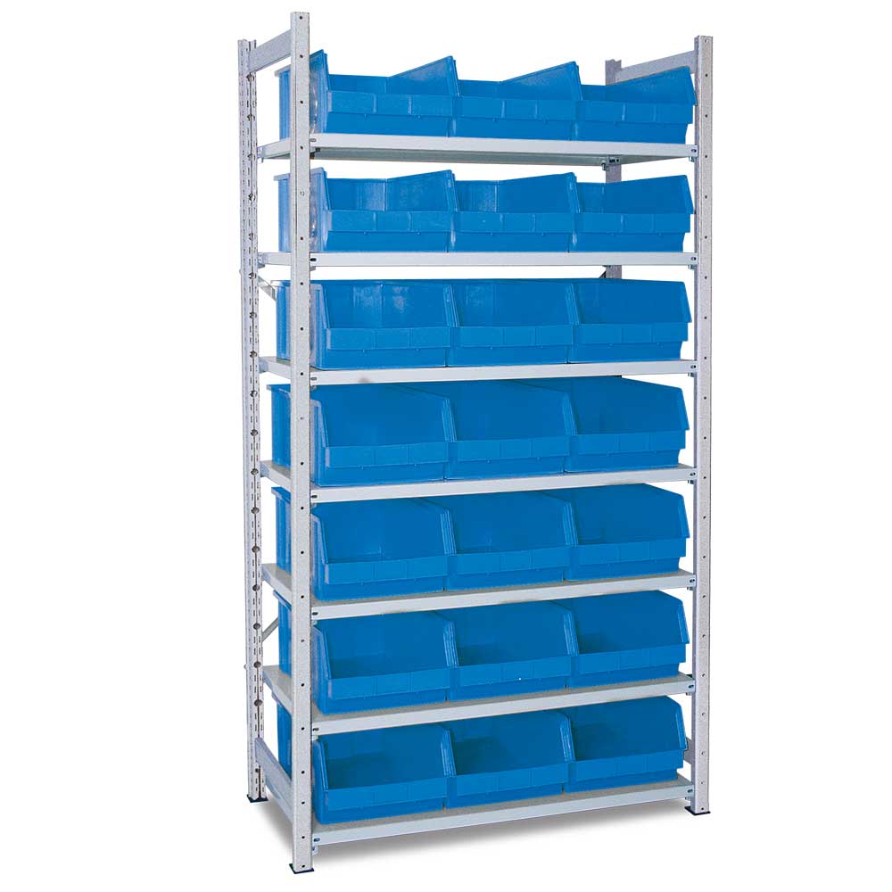 Steckregal, verzinkt, BxTxH 1070x515x2000 mm, 7 Böden, 21 Sichtboxen LB 2 Farbe blau