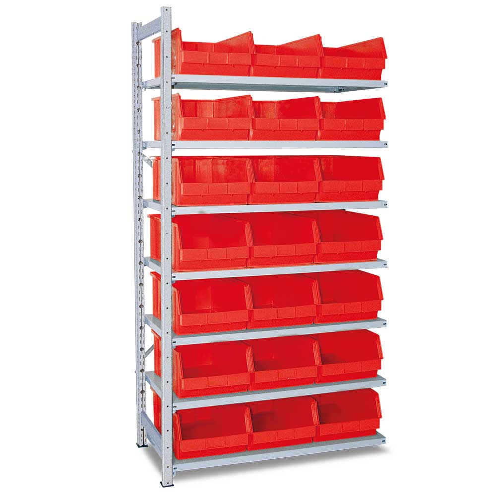Anbauregal, verzinkt, BxTxH 1000x515x2000 mm, 7 Böden, 21 Sichtboxen LB 2 Farbe rot